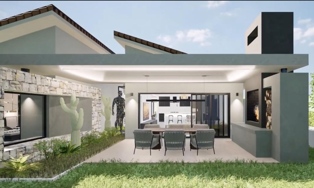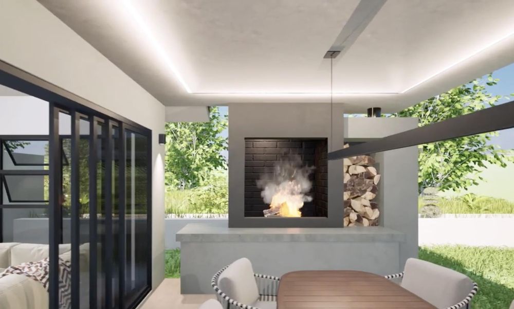 > Outdoor Integration: Large fold-back doors in the kitchen lead directly to the garden, while the lounge opens onto a covered patio with a built-in braai, creating a seamless indoor-outdoor experience.