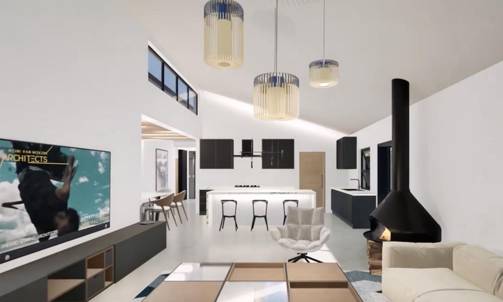 > Living Space: An open-plan layout flowing from the kitchen, dining area and living area.