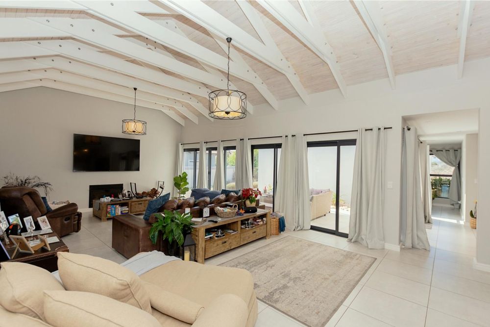 The lounge extends effortlessly onto a covered west-facing patio fitted with a pergola and shading, creating a comfortable space for outdoor relaxation. A fireplace adds warmth during cooler months, while the indoor braai area ensures easy entertaining throughout the year.