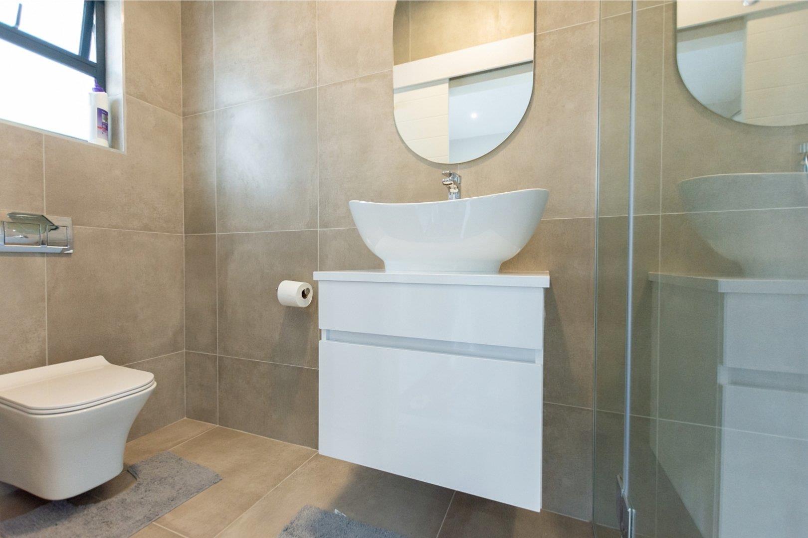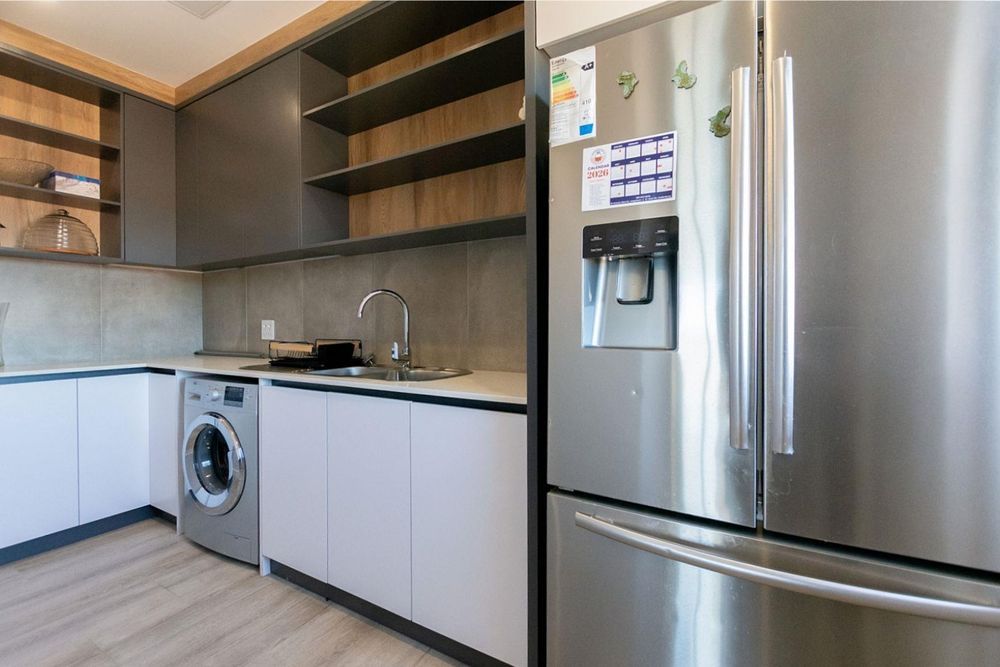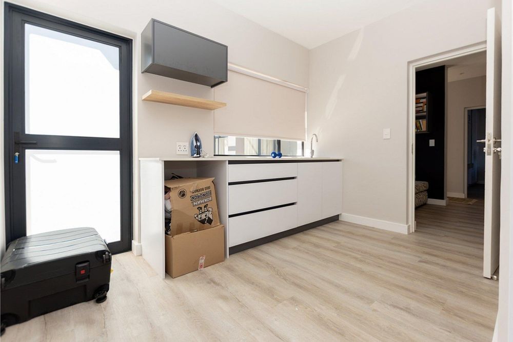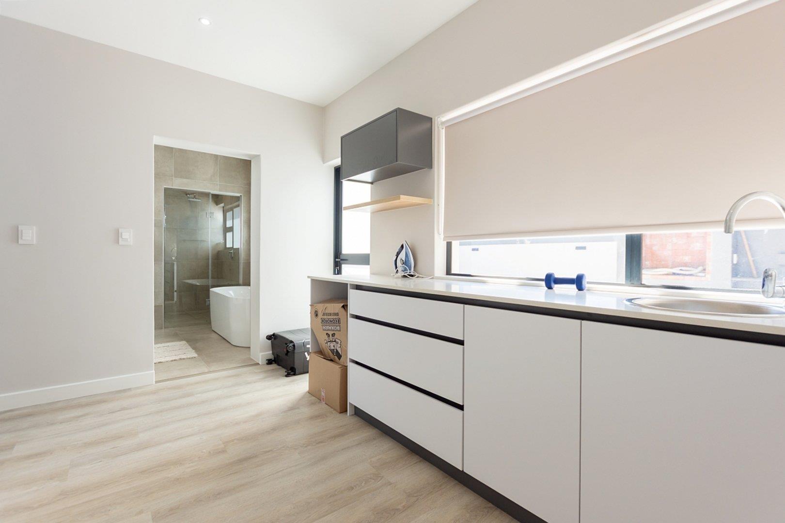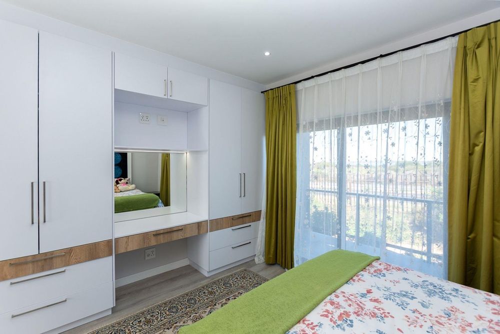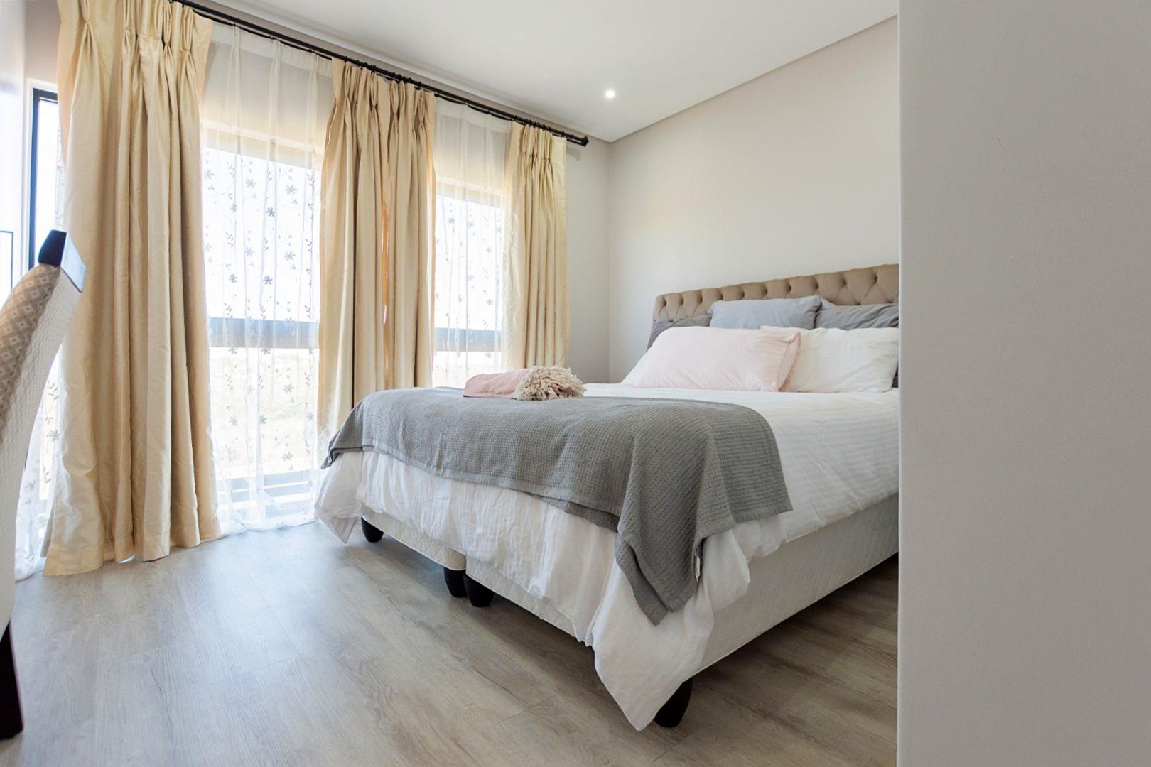 Upstairs, the main bedroom offers privacy and comfort with a full en-suite bathroom. The upper level also includes an open-plan kitchen and living area with an indoor braai and a guest toilet. Large windows fill the space with natural light and allow you to enjoy lovely lagoon views.