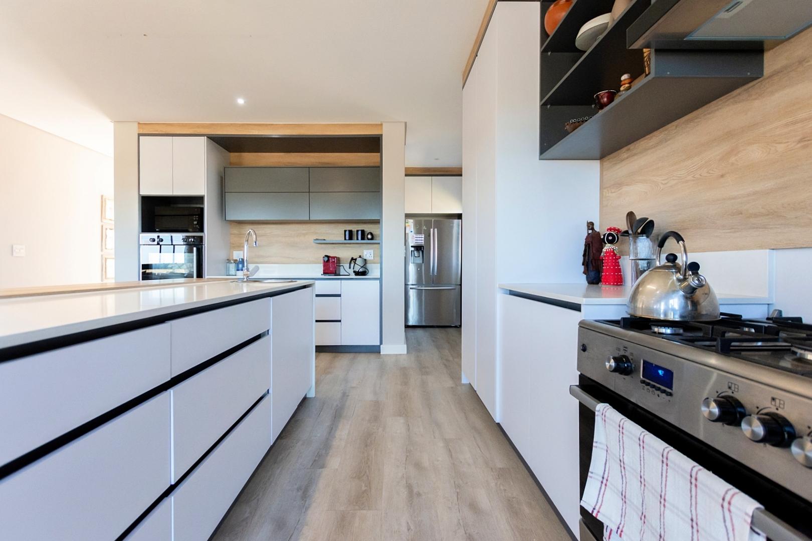 The kitchen is well-equipped with a centre island, ample cupboard space, a freestanding gas stove with electric oven, and a separate scullery for added convenience.