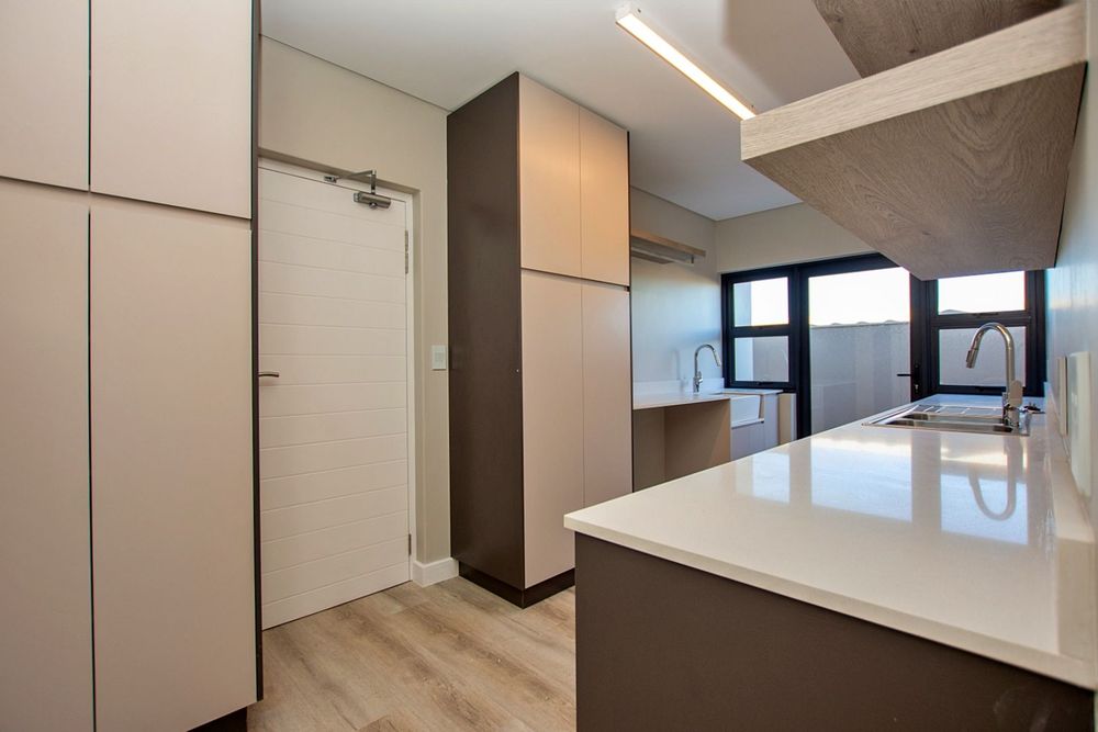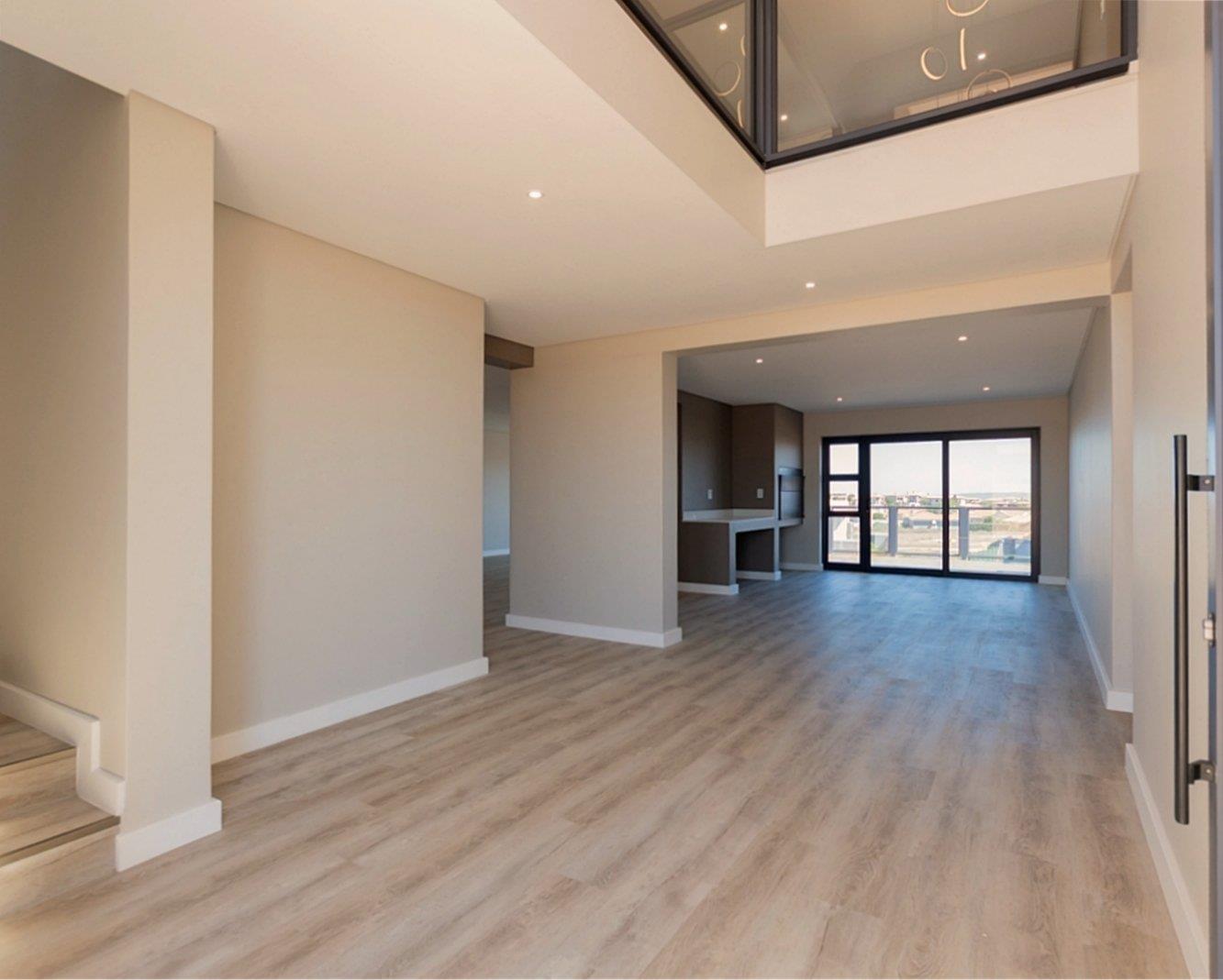 Embrace coastal country-living in Langebaan Country Estate with lagoon access and fynbos trails; open-plan layout opens onto a covered patio with built-in braai. Three bedrooms, 2.5 baths, double garage.