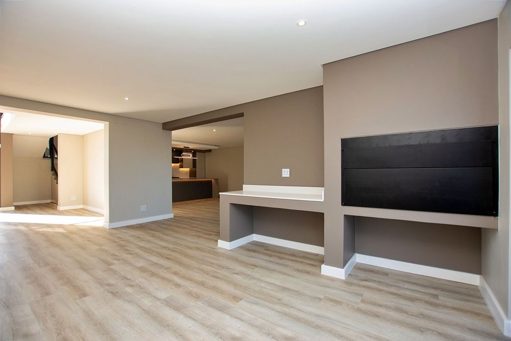 The living area is generously sized, flowing from the kitchen into the entertainment space, which includes a built-in braai, a dry bar, and a family lounge. Large sliding doors open onto a deck, with steps leading down to a beautifully landscaped garden.