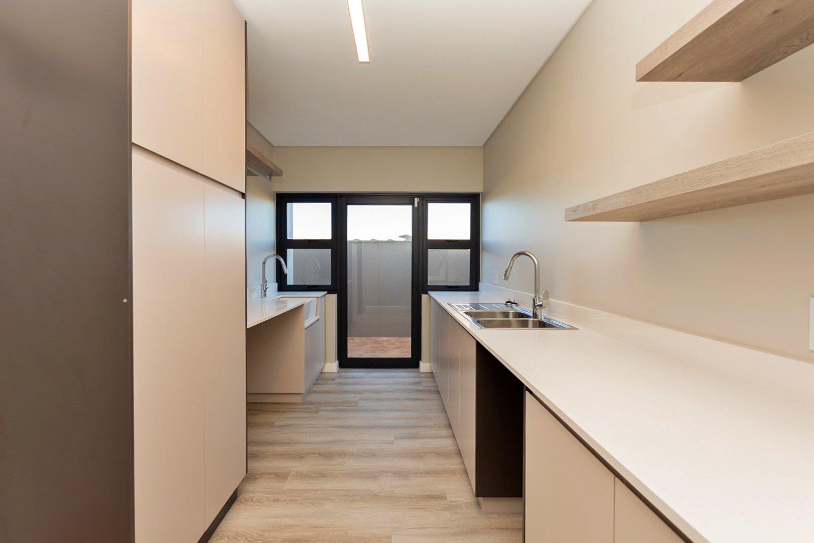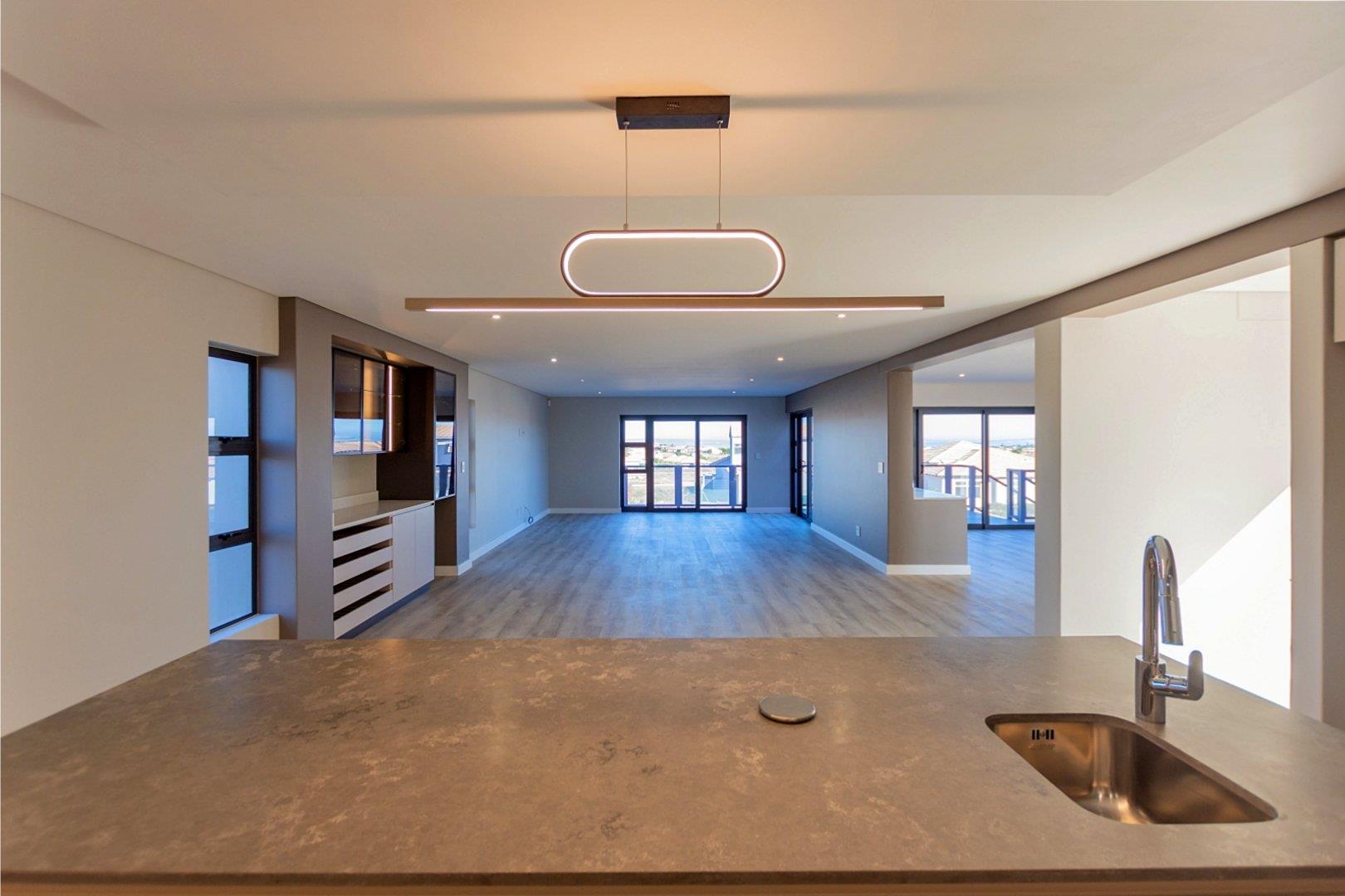 Relaxed West Coast estate living in Langebaan Country Estate with a north-facing braai terrace and partial sea views; modern open-plan kitchen, three beds, three baths, double garage.