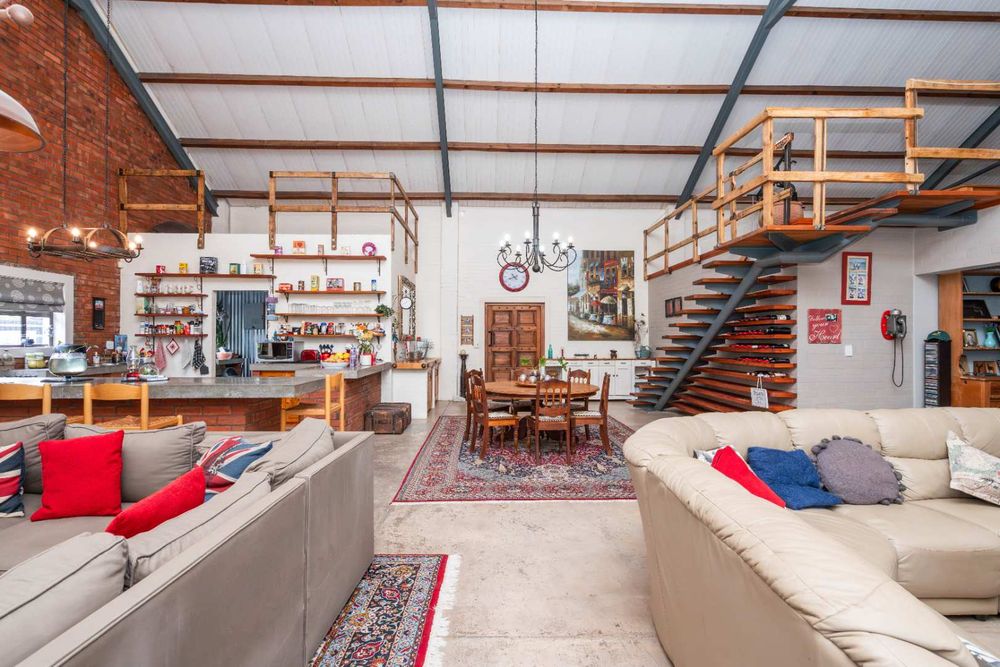 - Soaring double-volume ceilings with exposed wooden beams create a grand sense of space. An abundance of natural light pours in through large windows.