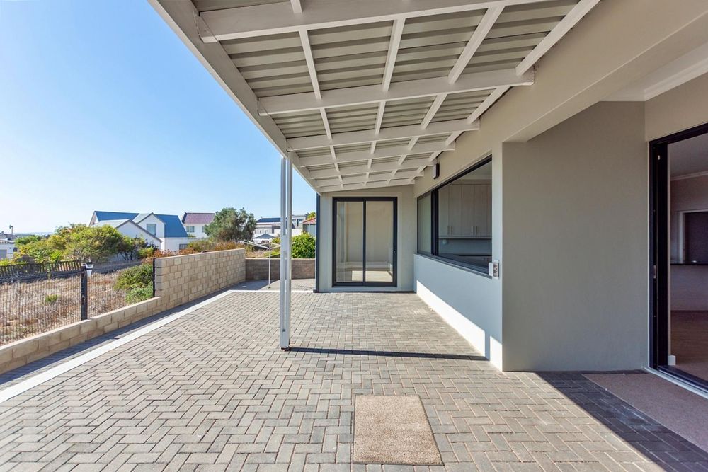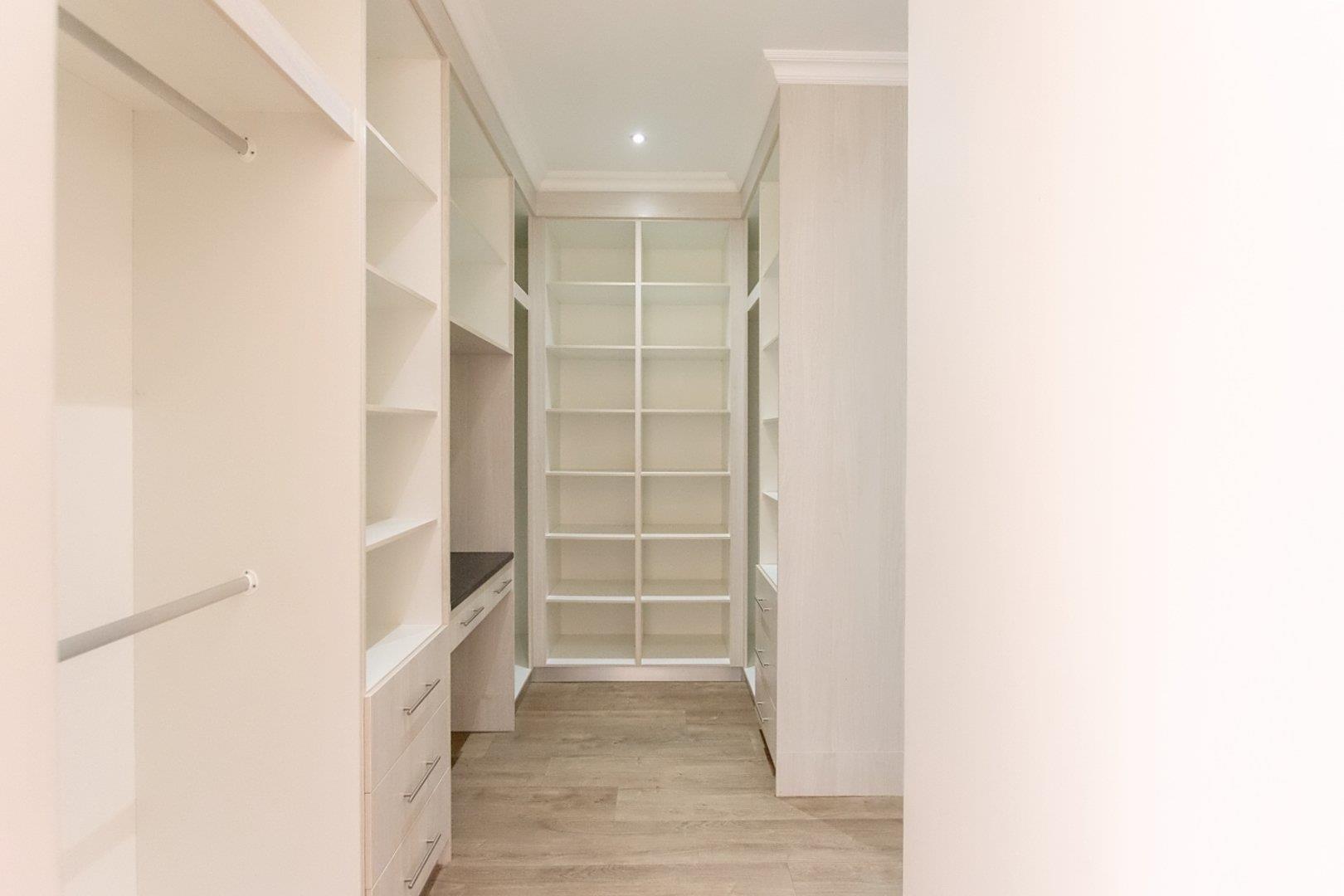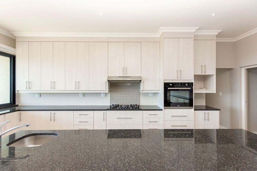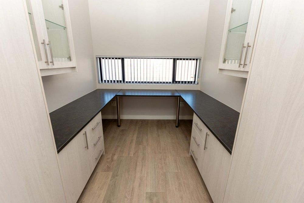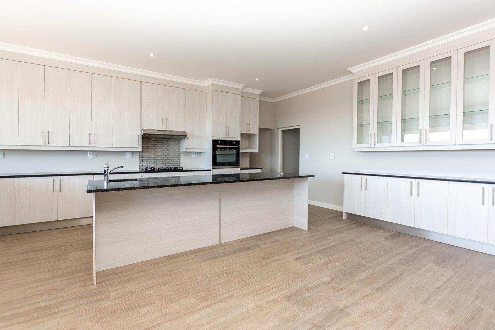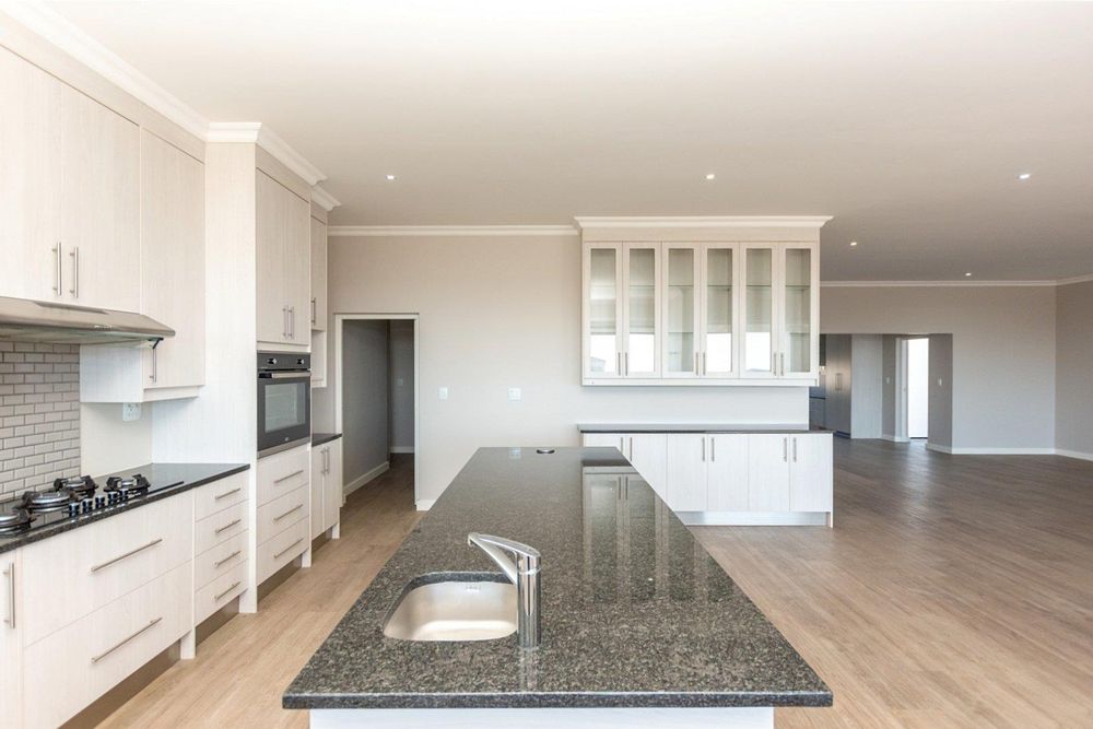 The home offers a generous open-plan kitchen and living area, designed with high ceilings and large windows to maximise natural light. The kitchen is both stylish and functional, fitted with gas hobs, an eye-level electric oven, a large walk-in pantry, and a separate scullery. Sliding doors open onto a north-facing covered patio with partial lagoon views, ideal for relaxed indoor-outdoor living.